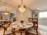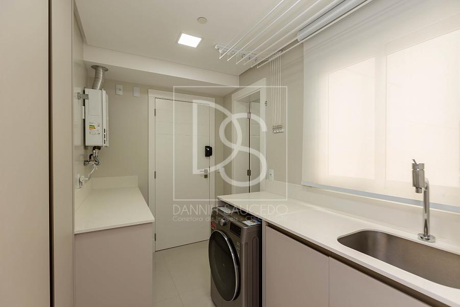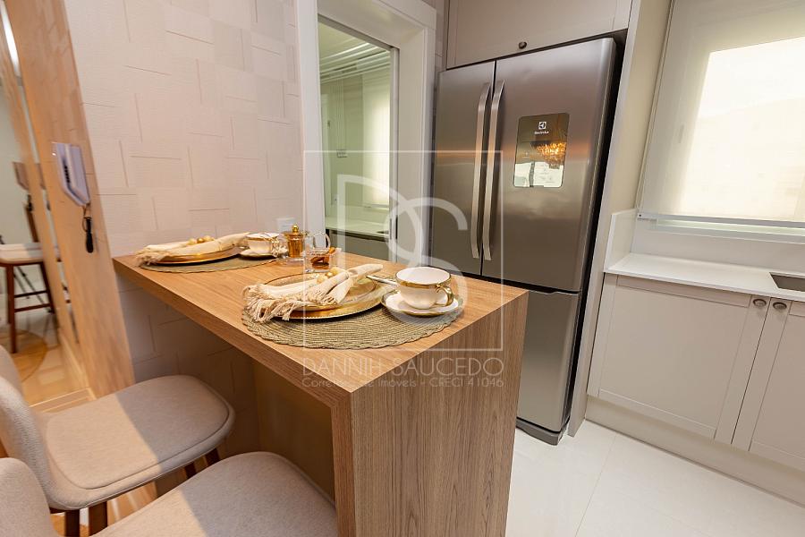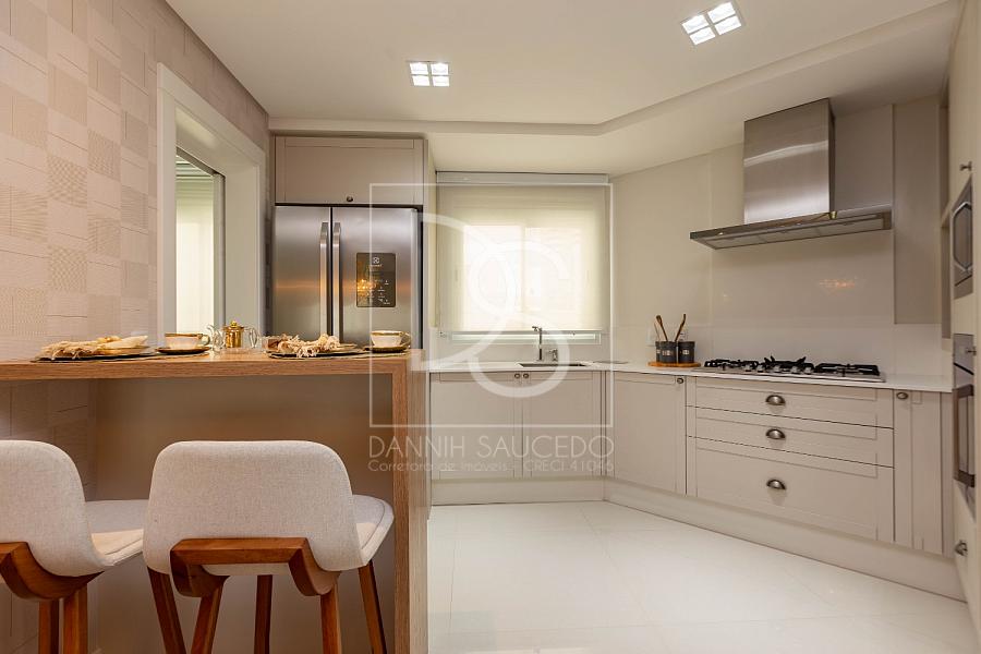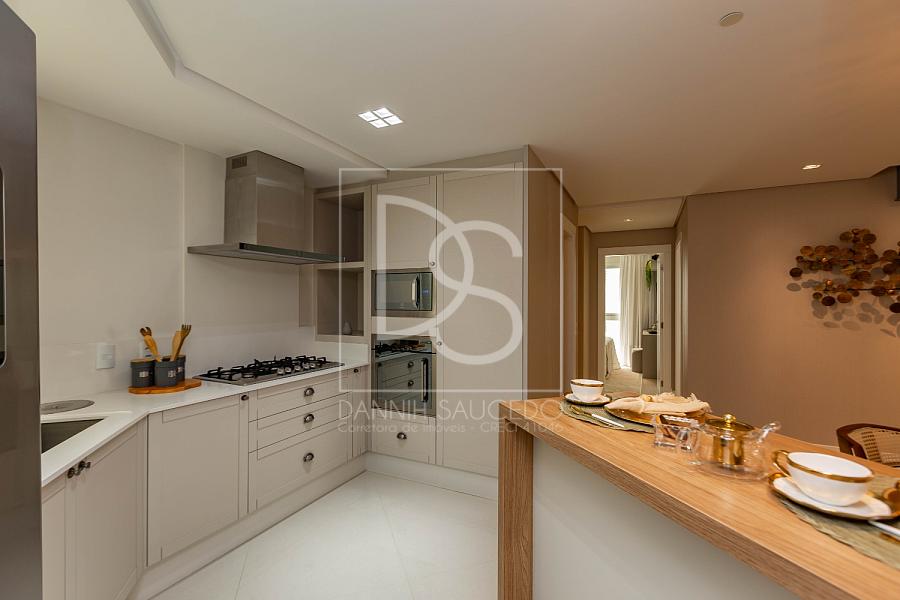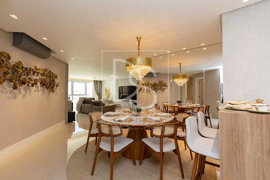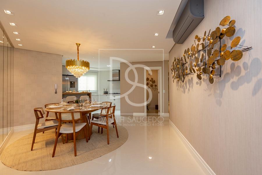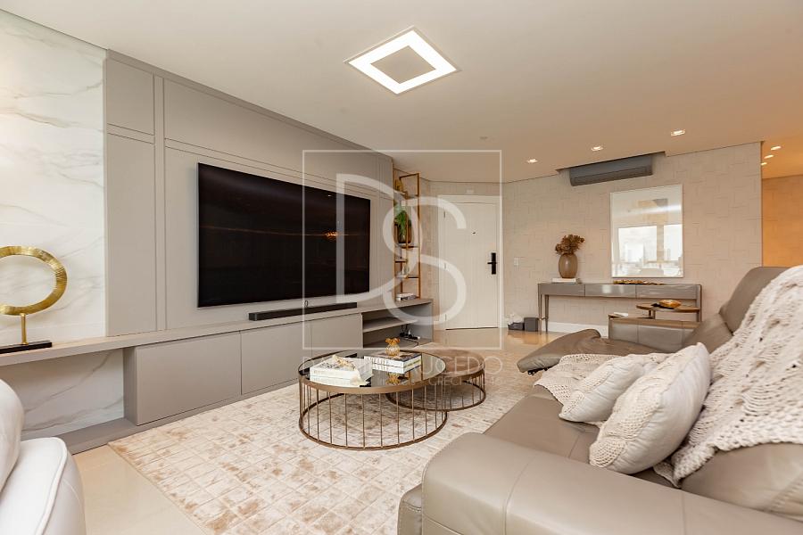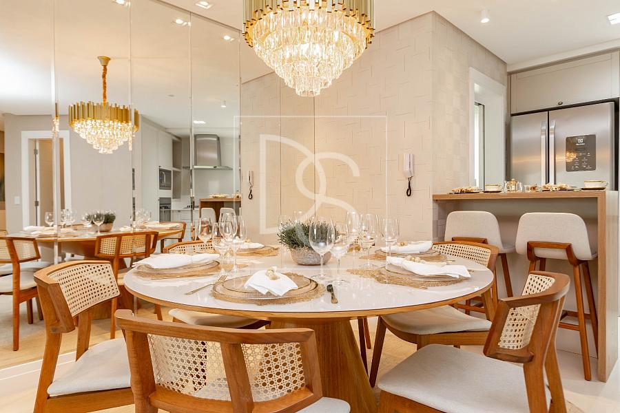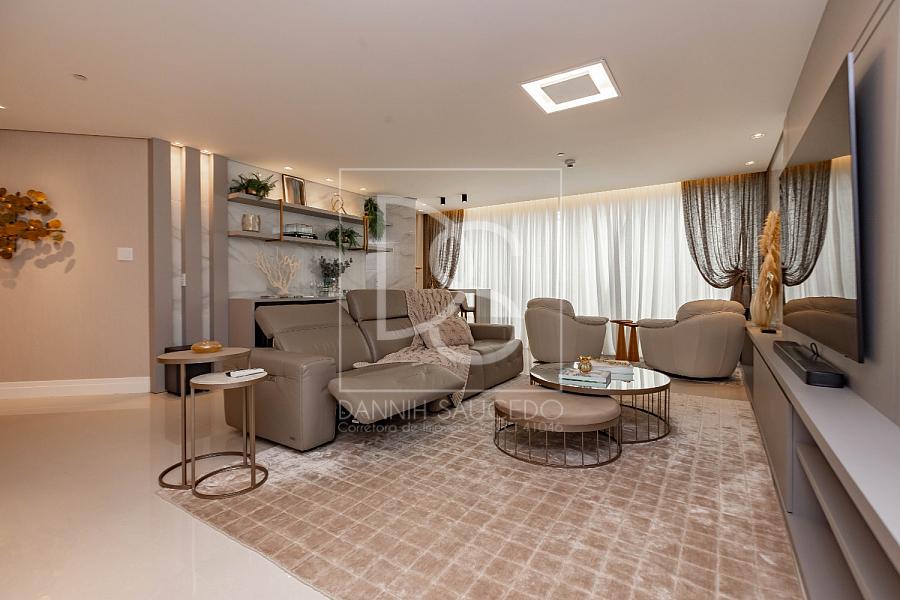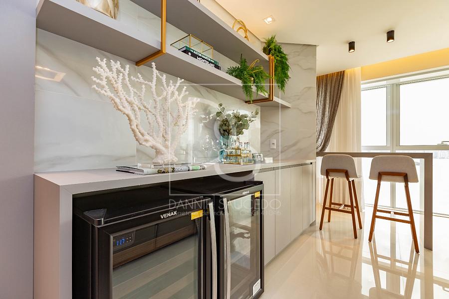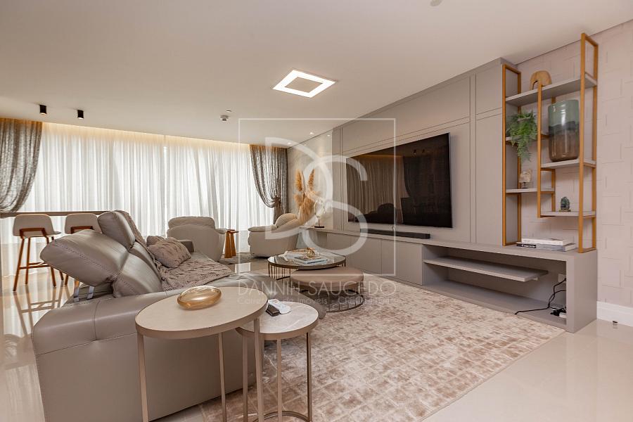A sala de estar, que comporta até 4 ambientes, se integra à sacada fechada com vidro, oferecendo um espaço amplo e iluminado. A cozinha americana conecta-se ao espaço gourmet, que inclui uma churrasqueira a gás, ideal para reunir amigos e família.